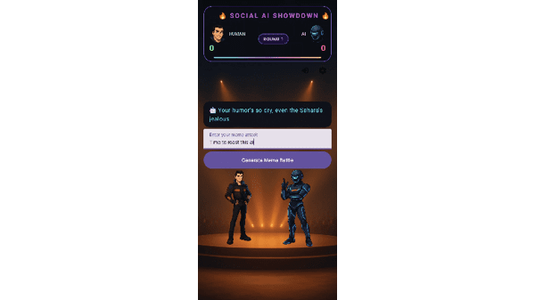A fast-paced 1v1 party-arena game where humans and AIs battle through meme and creativity challenges to win the crowd’s reaction. Quick, funny, and unpredictable—Social AI Showdown turns AI interaction into a live-showdown of wit and timing.